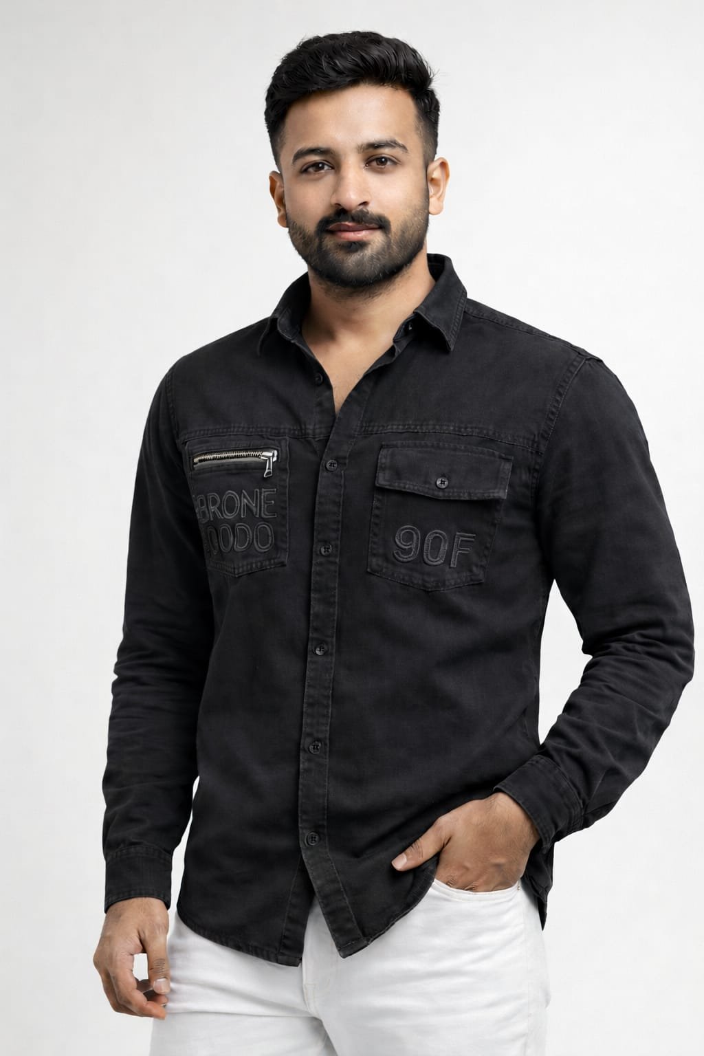 The shirt features dual chest pockets, including a stylish zipper pocket and embossed detailing that adds a unique touch. Full sleeves and durable stitching ensure long-lasting wear while maintaining a sharp appearance.