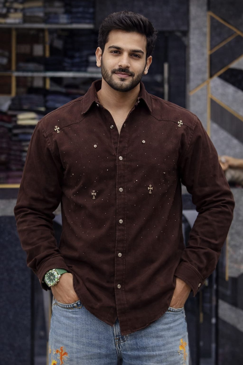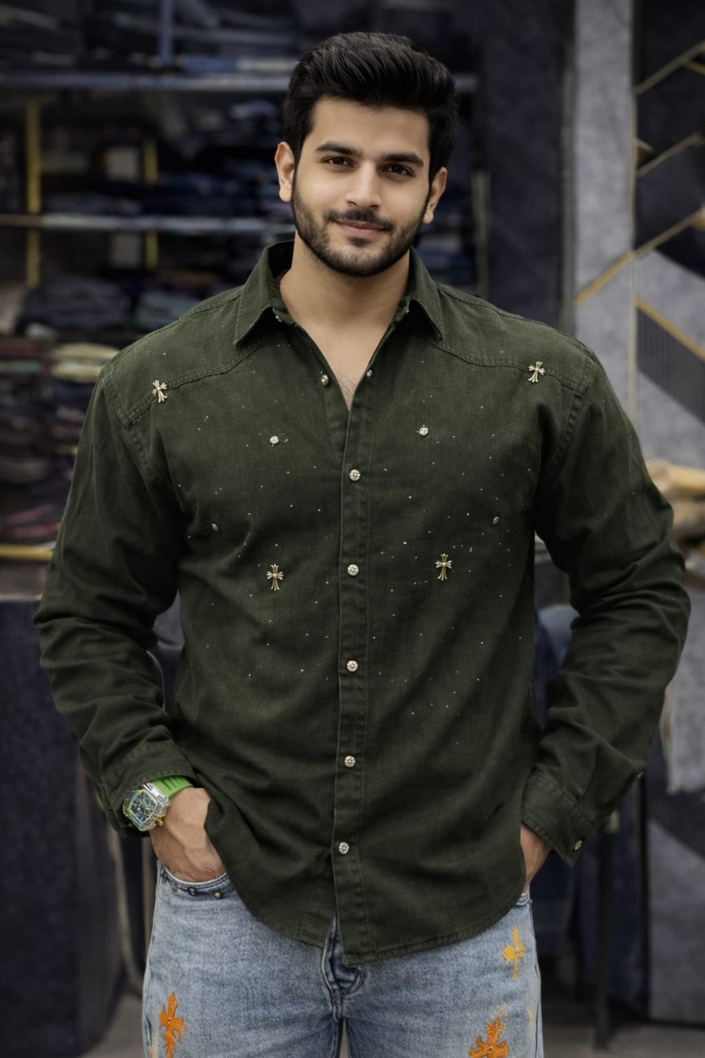 Crafted from high-quality breathable cotton, this shirt features subtle metallic cross embellishments and fine dotted textures that add a rich, premium feel. The clean button-down silhouette keeps it versatile, while the detailing elevates it above regular casual shirts.
