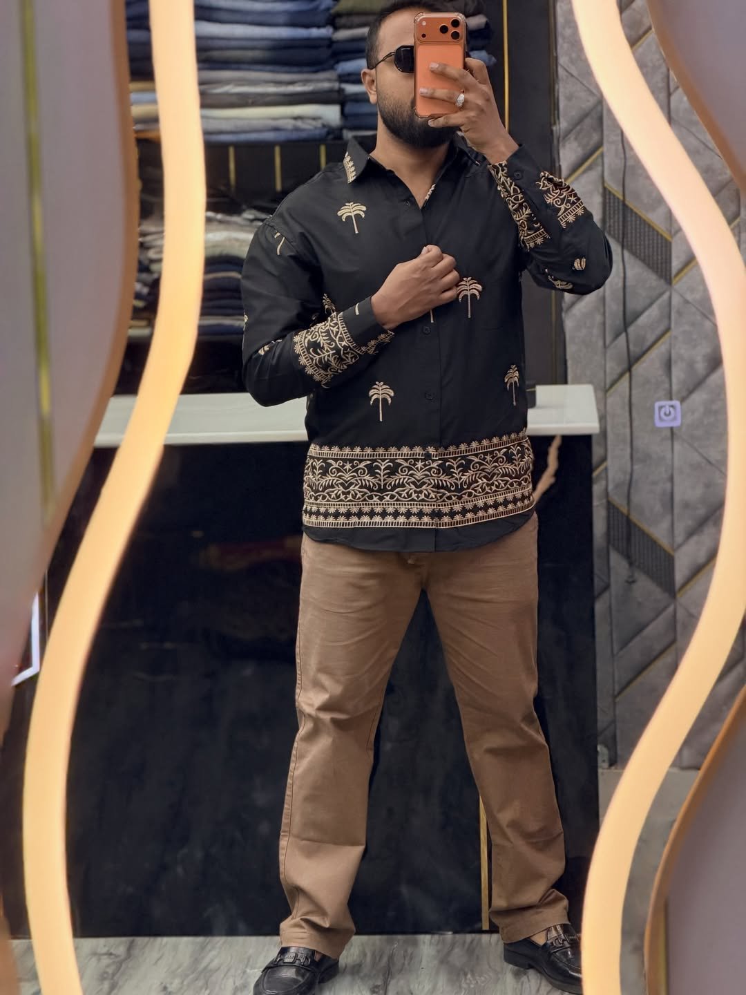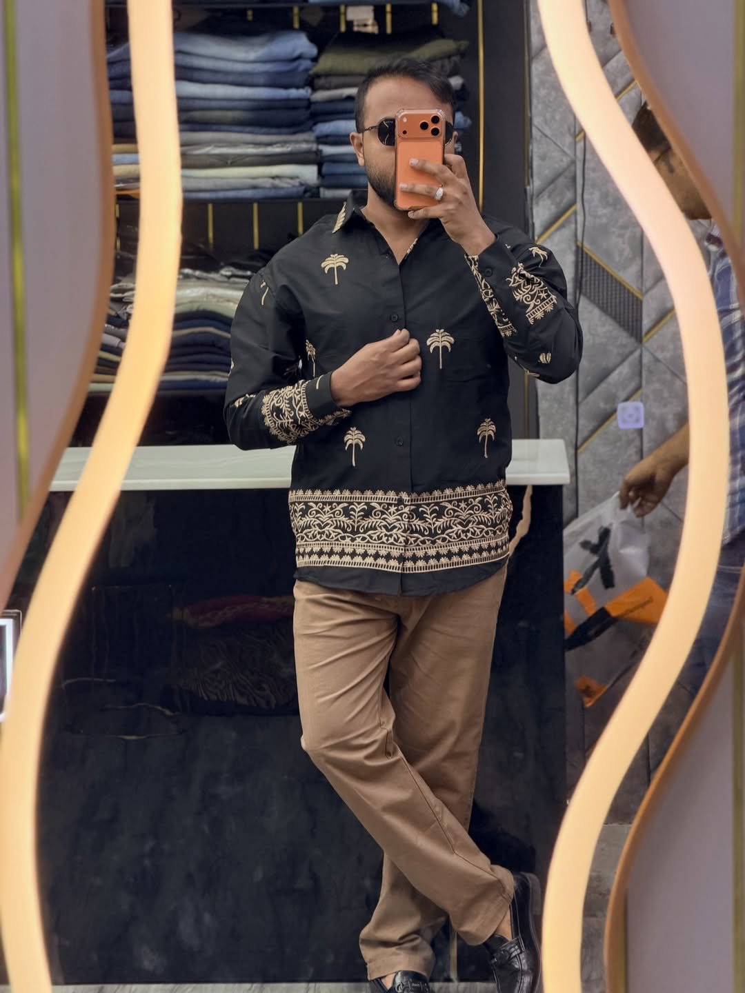 Make a bold fashion statement with this men’s embroidery designer shirt, crafted for men who appreciate luxury detailing and standout style. Featuring elegant embroidery patterns on sleeves, collar, and hemline, this shirt delivers a perfect mix of modern fashion and cultural elegance.